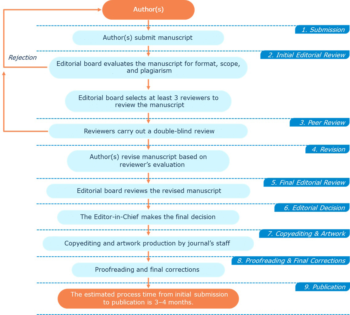 If the manuscript does not meet the format requirements, authors will be asked to revise and resubmit their work. In cases of desk rejection, authors may submit a revised manuscript after addressing the identified issues. Manuscripts that pass the pre-screening are then assigned to a minimum of three reviewers with expertise in the relevant field(s) for formal peer review. (Estimated processing time: 14–21 days).